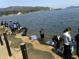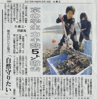 - 京都の学生(同志社、同志社女子、龍谷、立命館の4大学の学生30人)ボランティアによるカキ殻の除去作業を当会と協同して実施。波打ち際にたまった計5トンを掘り起こし撤去。 また、野田川周辺にかけても清掃。