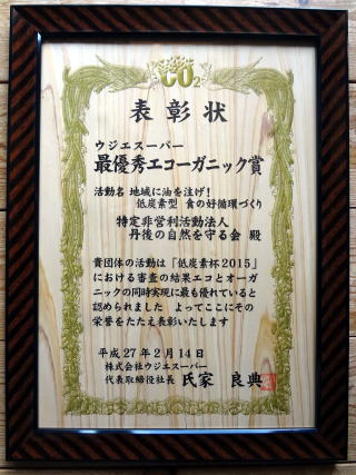 - 東京ビッグサイトで開催した「低炭素杯2015」は、全国1,730団体から選ばれたファイナリスト39団体(企業・学校・NPOなど)が、4つの部門(地域活動、企業活動、学生活動、地域エネルギー部門)のプレゼンテーションを行い、当会の「地域に油を注げ! 低炭素型 食の好循環づくり」が「ウジエスーパー最優秀エコーガニック賞」を受賞いたしました!!