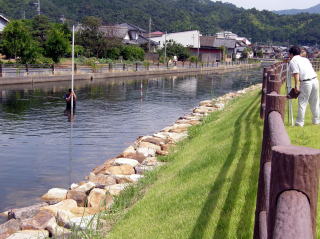 ●調査法 :阿蘇シーサイドパーク内・水路の一区画約400u内にバイオコロニーを散布し、その散布前と散布後のヘドロの状態(ヘドロの厚み/cm)変化を測量調査した。